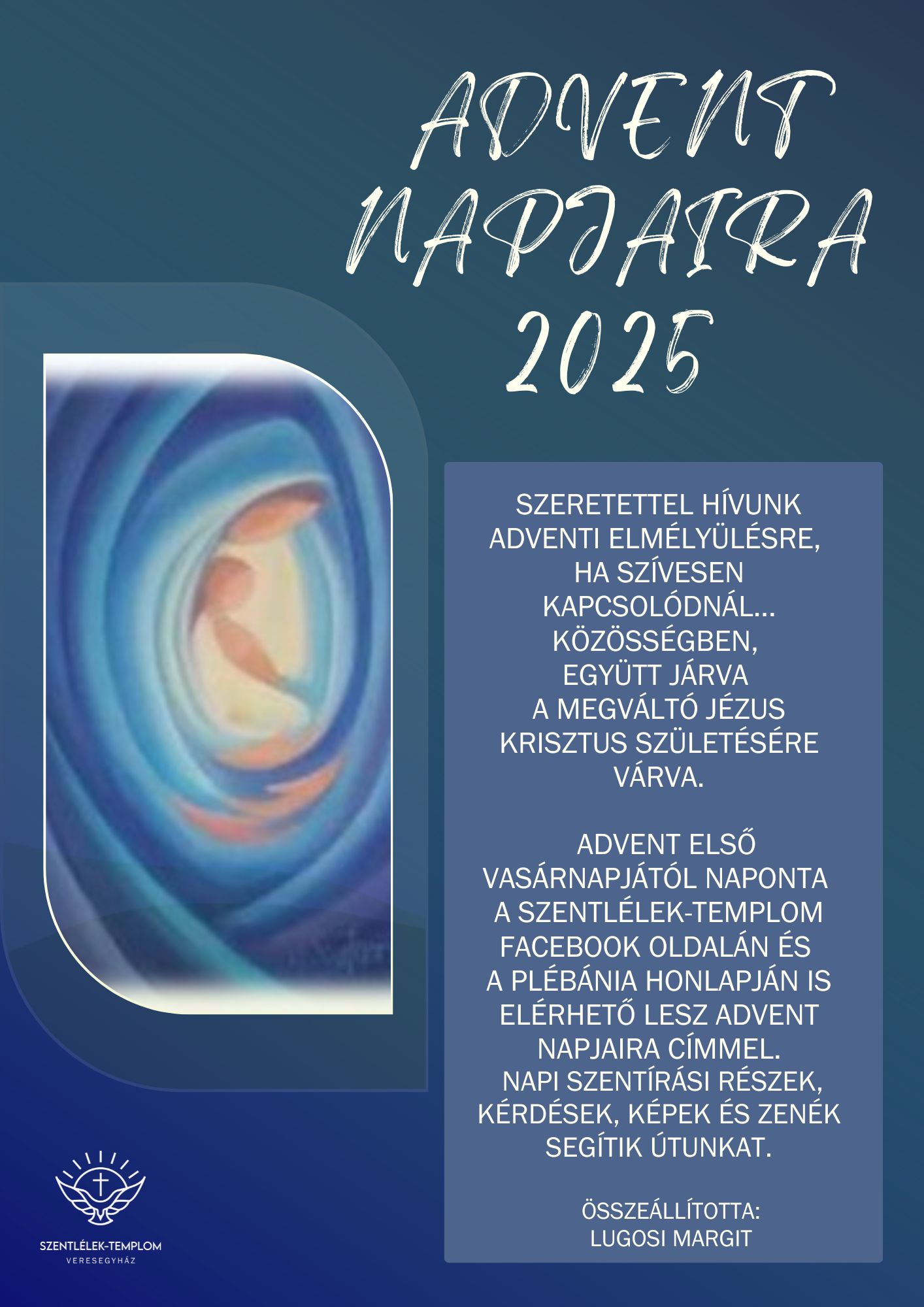 HírekLelkiség Adventi töltekezés 2025-11-22 [Diavetítés indítása] 0 Facebook Twitter Google + Pinterest admin előző bejegyzés Énekes-gitáros dicsőítés következő bejegyzés FILI – a Szentegyházi Gyermekfilharmónia koncertje You may also like Úrnapi szentmise közvetítés – 2020. június 14. 2020-06-14 Advent 2019-11-30 Felhívás imára a Covid elmúlásáért 2021-03-30 A remény zarándokai 2024-12-29 Gondolatok az Ökumenikus Imahéthez – 2022. január 17-21. 2022-01-23 A szeretet himnusza 2024-02-22 2014. évi Szent Erzsébet-napi körlevél 2014-11-15 Ökumenikus imahét 2022-01-16 Online gitáros Szentségimádás 2021-03-22 Húsvéti készület – a Nagyhét 2021-03-30