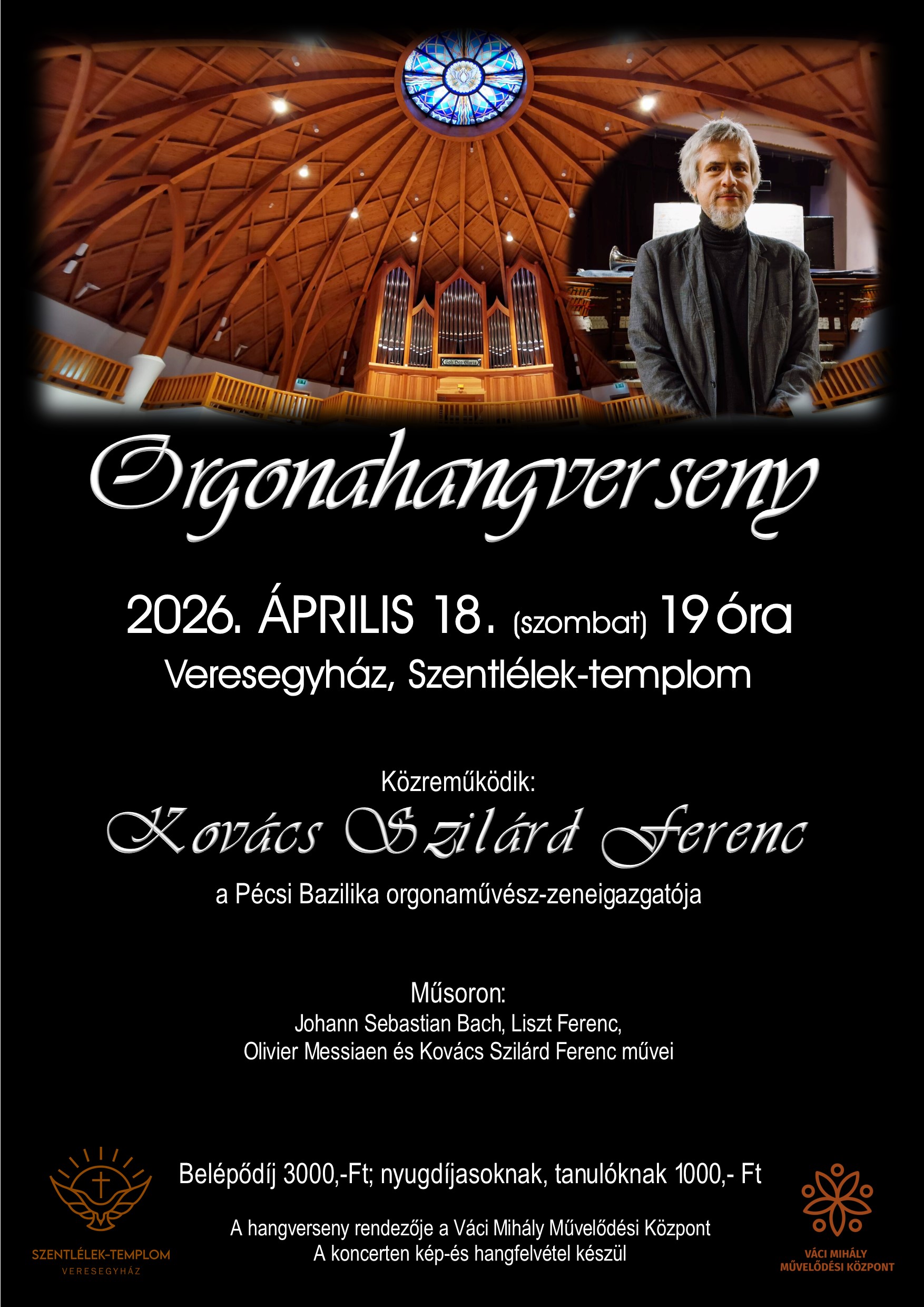 - Szeretettel hívjuk a kedves testvéreket orgonahangversenyre április 18-án, szombaton este 19 órakor templomunkba. A hangversenyen közreműködik Kovács Szilárd Ferenc orgonaművész. A műsorban Bach, Liszt és Messiaen művei hangzanak el. A belépődíj 3000 forint, nyugdíjasoknak és diákoknak 1000 forint. Mindenkit szeretettel várunk.
